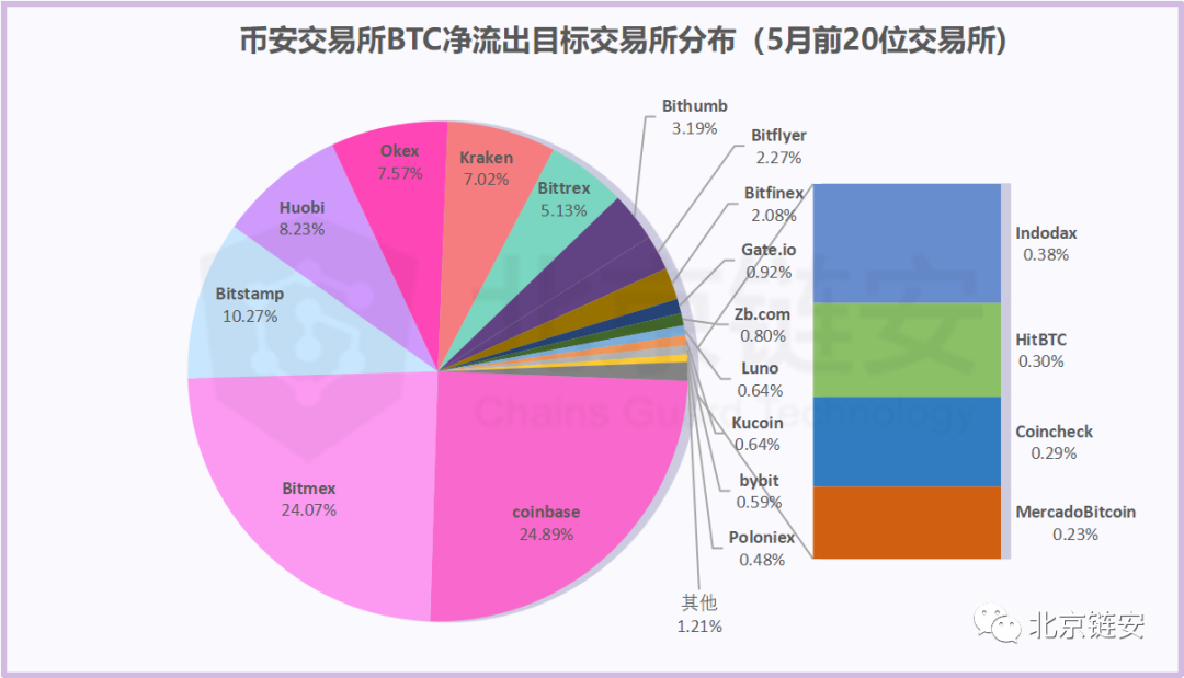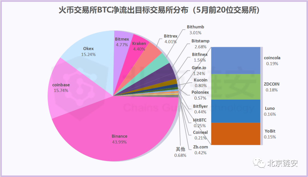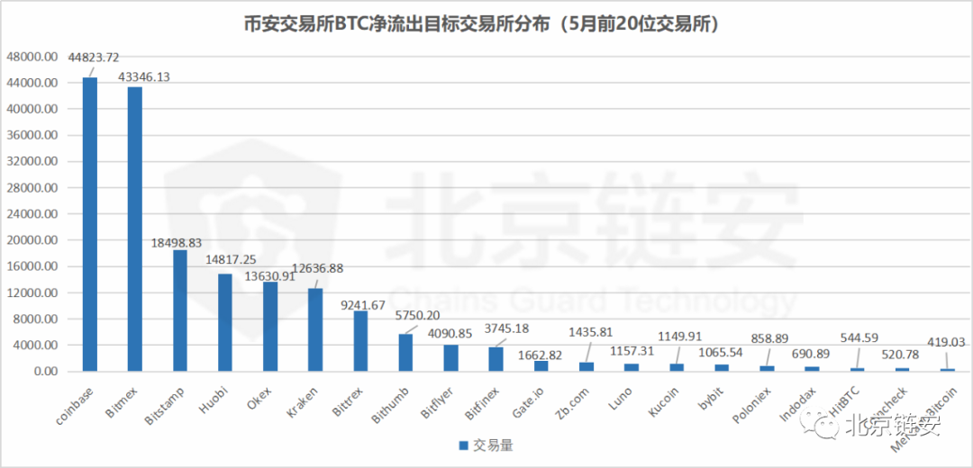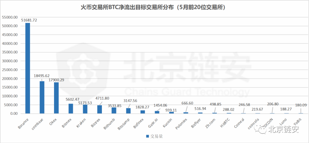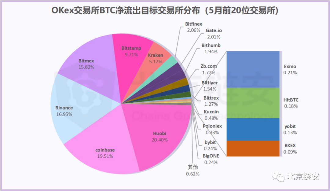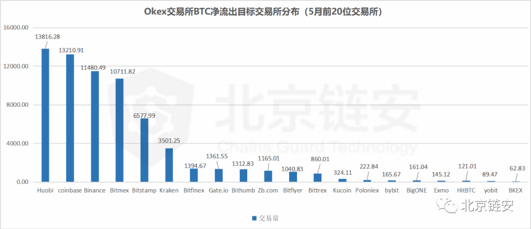 接下來,讓我們看看,在5月份,幣安、火幣、Okex交易所提出的BTC,又主要流向了哪些交易所呢?經過我們的分析,列出了可以識別的前20位交易所的數據。