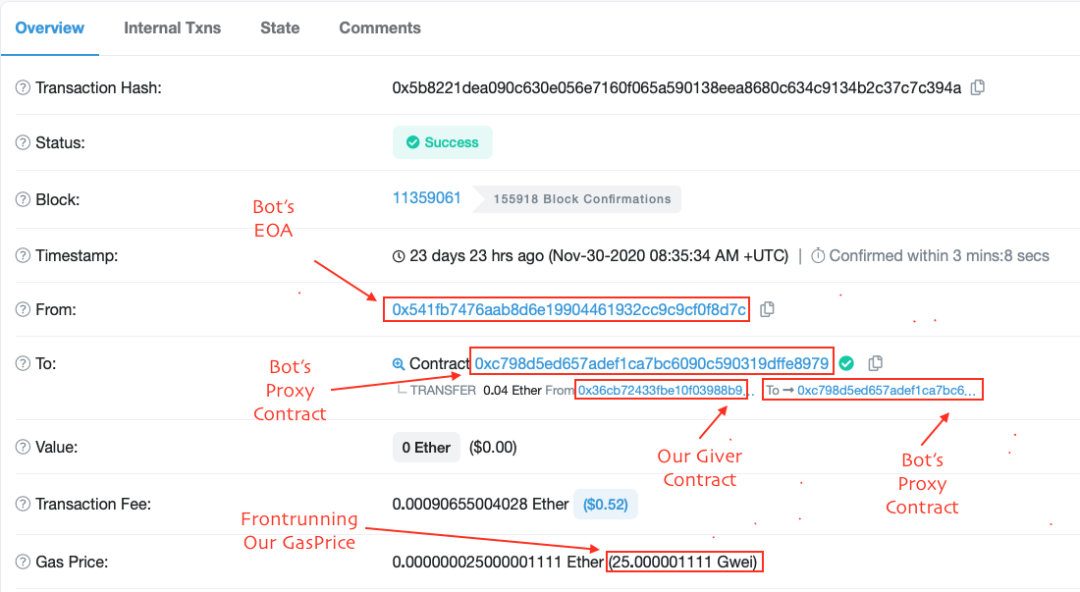 考慮到機器人的相同行為模式(從賬戶A調用代理並將資金傳遞到賬戶B)和事件的臨近性,有理由認為機器人在該事件中也在對白人黑客進行普遍的Frontrunning操作。