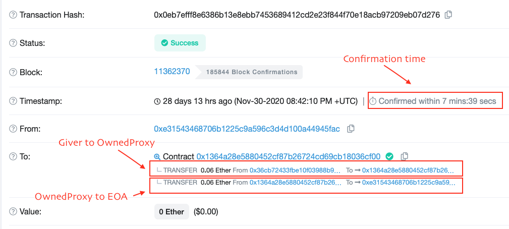 在第一次嘗試中,對OwnedTaker合約的交易花了大約1分鐘時間挖掘,我們成功地提取了資金。