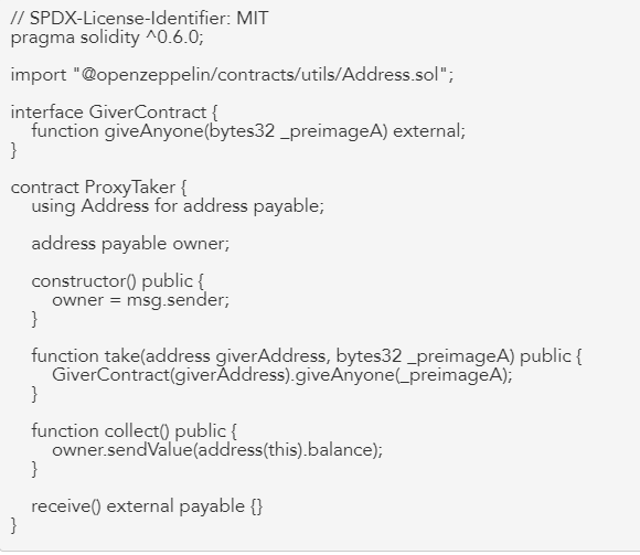 為了讓這個挑戰更有趣一點,我們又做了一次混淆的嘗試,這次使用了一個只有我們可以使用的代理合約,一個OwnedTaker。