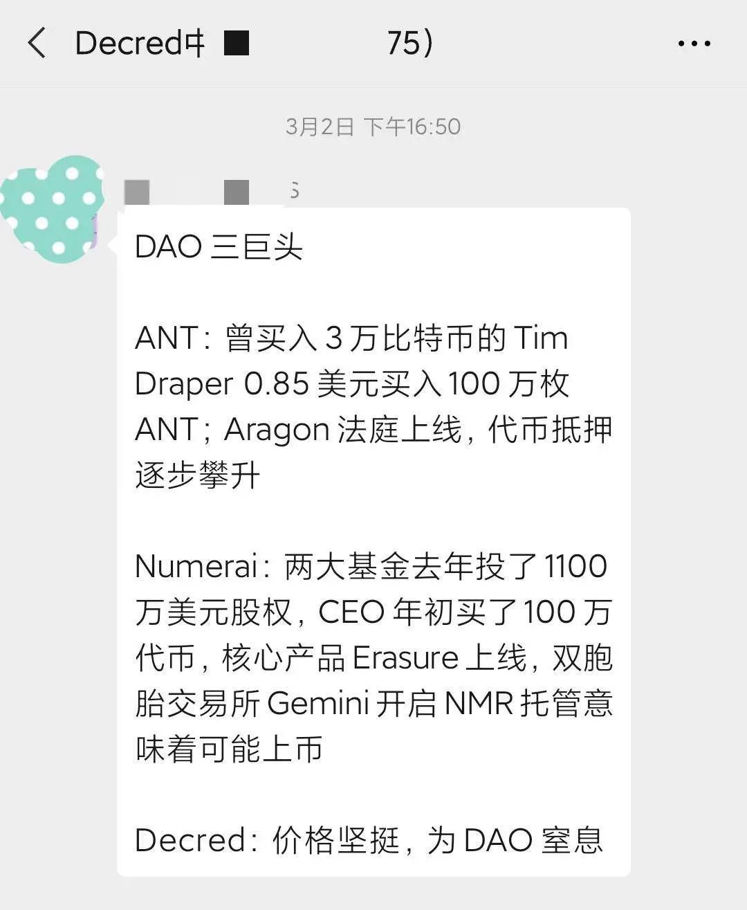 該名成員將Aragon(ANT)、Numerai 和Decred 列為“DAO三巨頭”,並寫下了自己的理由,儘管很簡單,但基本代表了外界對Aragon 的讚嘆:有矽谷風投教父Tim Draper 這樣的傳奇人物的加持,在今年2 月份注資85 萬美元購買其代幣ANT,並親自擔任項目顧問。