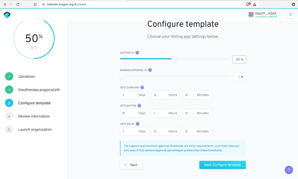 Aragon 投票機制的參數調整頁