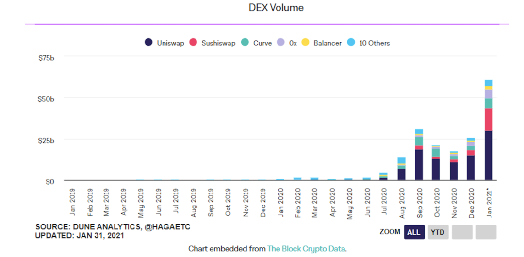 UNI的上涨与Uniswap交易量的爆发密切相关。The Block Research收集的数据显示,Uniswap 1月份交易量突破300亿美元,创造了历史新高。而去年9月,Uniswap的单月交易量还在154亿美元,这一数据超越了当月Coinbase的交易量。