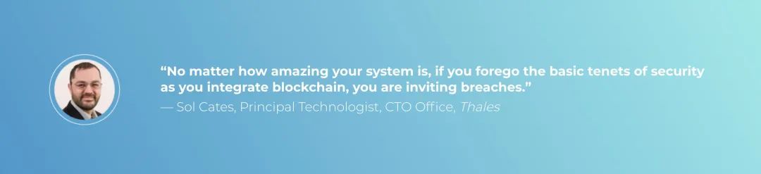 “儘管有了這項尖端、新穎的技術,網絡安全仍然可歸結為公鑰基礎設施的老問題和三條安全規則:機密性、完整性和可用性。無論你的系統有多麼驚人,如果你在整合區塊鏈時放棄了安全的基本原則,那你就是在招致漏洞。”
