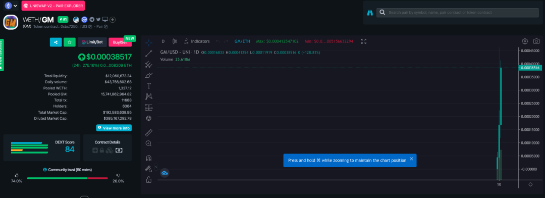 數據網站dextools.io顯示,截至11日下午3點50分,Uniswap的GM/ETH流動性池子TVL在1200萬美元,其中ETH1304枚。日交易量多少呢? 4377萬美元。如果以該數據計算,它的總市值就是2億美金(總量5千億枚)。
