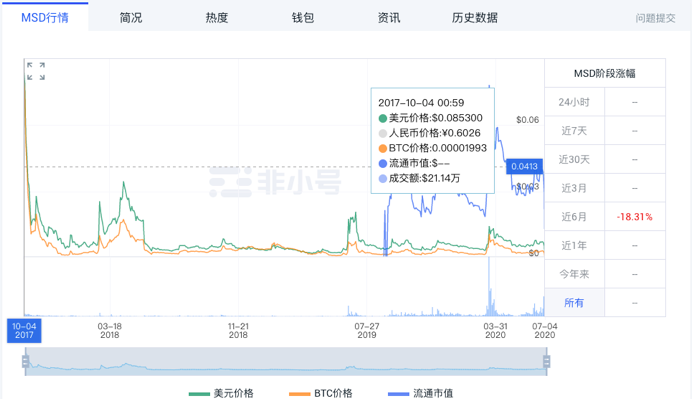 非小號顯示, MSD於2017年10月上線二級市場,初始價格約為0.1美元左右,上線後一路下跌。截至7月3日下午三點,暫報0.0055美元,較初始價跌幅94.5%。