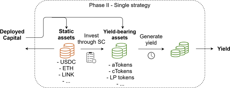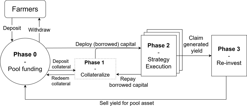在階段1,池子中的資金被用作抵押,通過Compound、Aave或Maker等貸款平台借入另一項資產。這個階段並不總是必要的,可以跳過。此步驟的主要用途是允許使用另一種資產(而不是最初的集合資產)執行Yield Farming策略。例如:在SimpleYield ETH池子中用戶充值的ETH可以放入Maker,從而藉用穩定幣DAI。