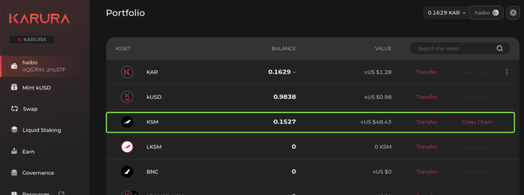 鏈上交易成功之後就可以在Karura 頁面看到對應的KSM 資產了。
