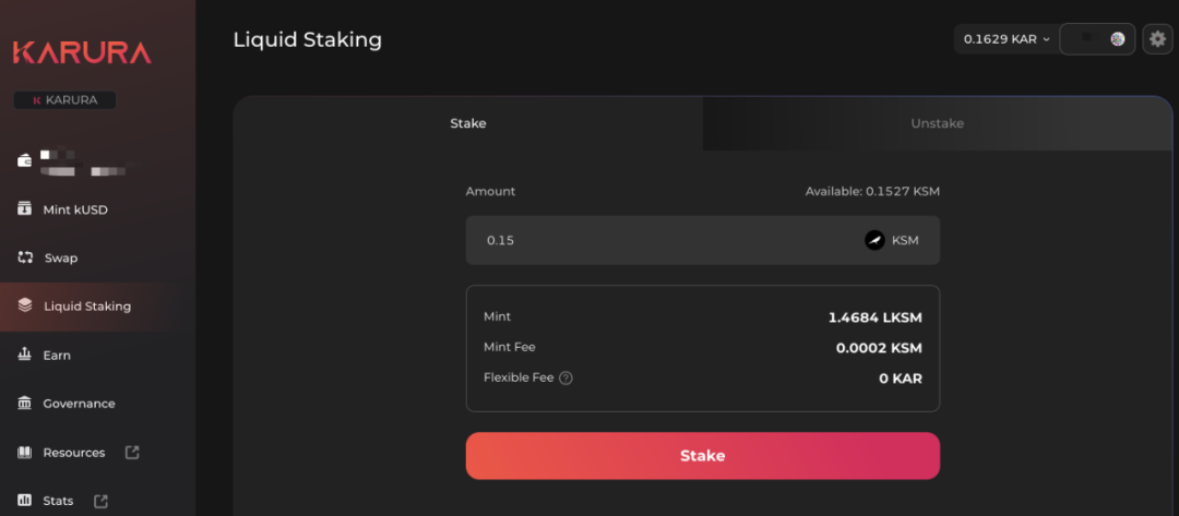 第二步:在“ Liquid Staking ” 頁面用Karura 鏈上的KSM 鑄造LKSM 並開啟。