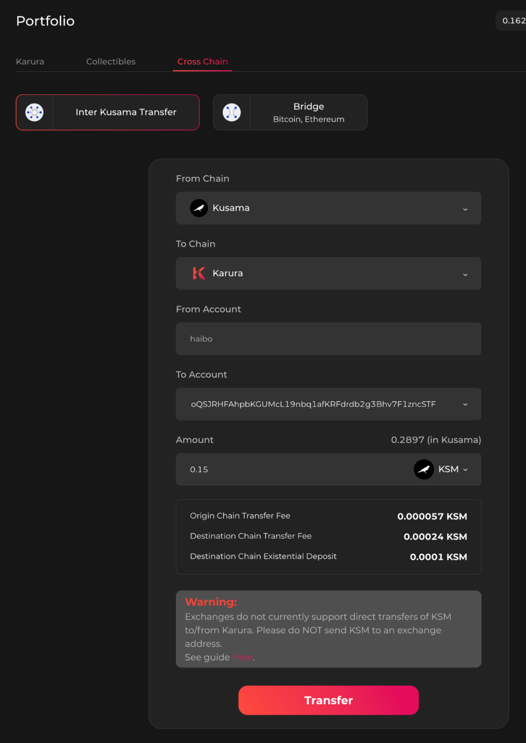輸入需要跨鏈地址和KSM 數量,點擊“ Transfer ” 將Kusama 網絡上的KSM 跨鏈到Karura 網絡上