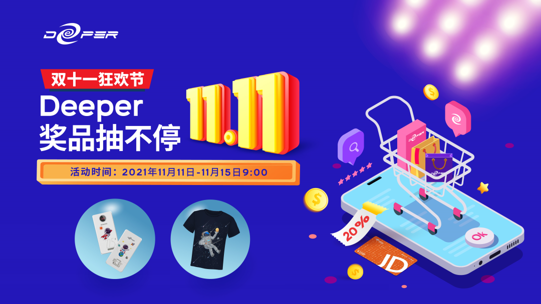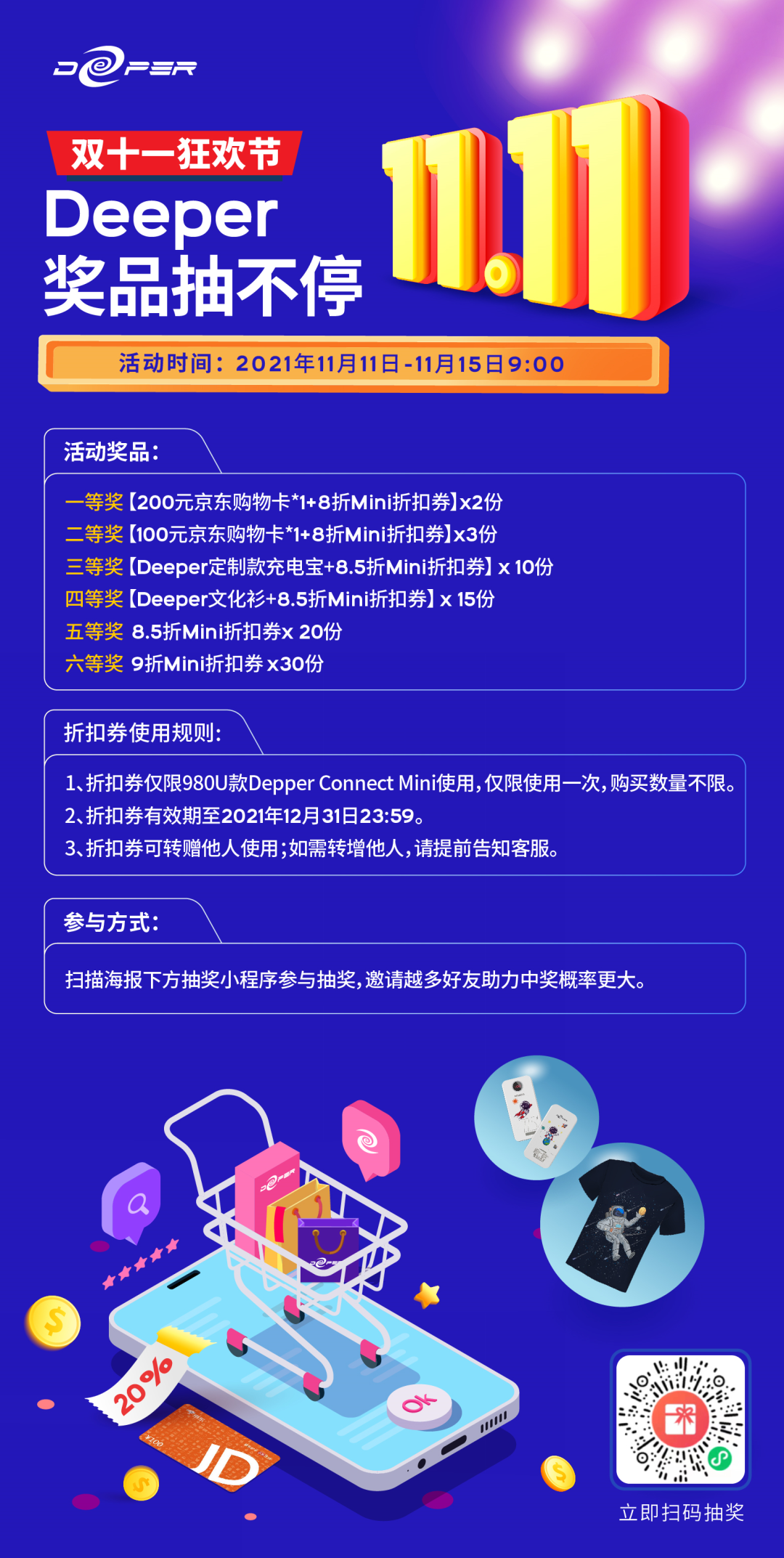 適逢一年一度的雙十一狂歡節慶,Deeper為感謝新老用戶的關注與支持,特此重磅推出抽獎活動,只需一鍵掃描下方二維碼,就有機會獲得價值200元京東卡、 Deeper周邊、以及Deeper mini優惠券,邀請好友助力獲獎概率更高。