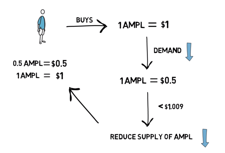 因此,如果愛麗絲以1美元的價格購買了1個AMPL,由於需求的減少,AMPL的價格下降到0.5美元,系統將減少AMPL的供應。愛麗絲最終得到價值0.5美元的0.5 AMPL,因為1 AMPL的價格又恢復到1美元。