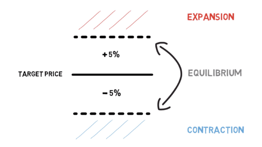 舉個例子,如果AMPL當前價格為1.10元,目標價格為1.009元,系統處於擴張狀態,因為1.009+1.009元*5%=1.05945元,1.10元高於最大價格,仍然可以稱得上是平衡狀態。