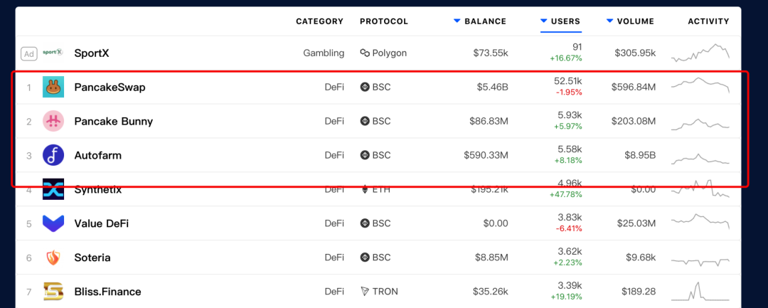 從DeFi 項目用戶量看,BSC 的代表項目Pancake 和Autofarm 表現亮眼,儼然進入了DeFi 第一梯隊。