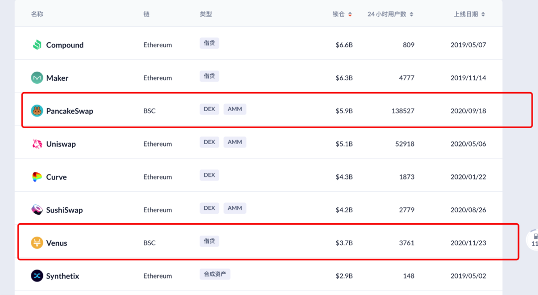 以鎖倉量為標準衡量,對比各鏈上DeFi 項目表現,根據DeBank 的數據,PancakeSwap 和Venus 這兩個來自於BSC 的項目,也引入前十。其中PancakeSwap 的鎖倉量超過了Uniswap。