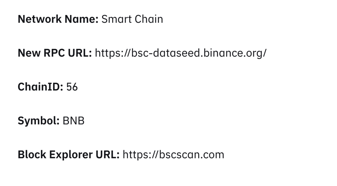 MetaMask 是最常見的以太坊錢包,使用BSC 時候也仍然是最常見的方式之一。唯一需要更改的是,需要在Metamask 之中設置自定義網絡為BSC,具體配置如下: