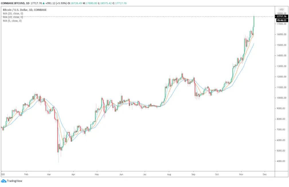 比特幣的價格正在飆升至1.8萬美元,興奮的交易員認為這一頂級數字資產將可能超過2017年的歷史高點19763美元。