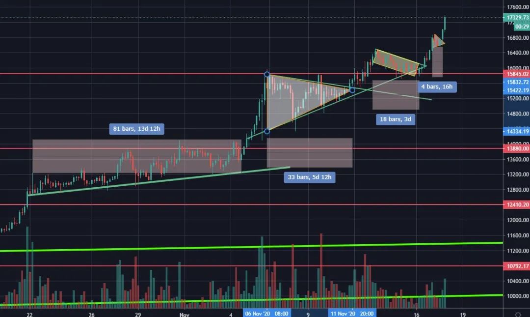 自從11月8日下跌以來,比特幣的價格已從14344美元上漲至17858美元。比特幣的漲幅就達到了近25%,並進入了一個明顯的盤整階段。