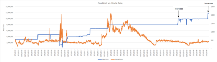 通过与许多矿池的紧密合作以及在以太坊网络层的运行,我们可以进一步验证网络所处的健康状态以及支持更高每秒交易处理量(TPS)的潜力。在燃气上限提高25%后叔块率并未发生显著上升。同样的情形也发生在去年9月的25%燃气上限上调(在波思路网络部署后发生的)。