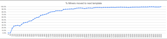 我们可以看到几乎20%的矿池在新区块产生后的100毫秒(0.1秒)内开始挖下一个区块,在0.6秒的时候有一半的矿池开始加入行动。最后,在1.5秒内将近90%的算力已经投入新一轮报块的竞赛。