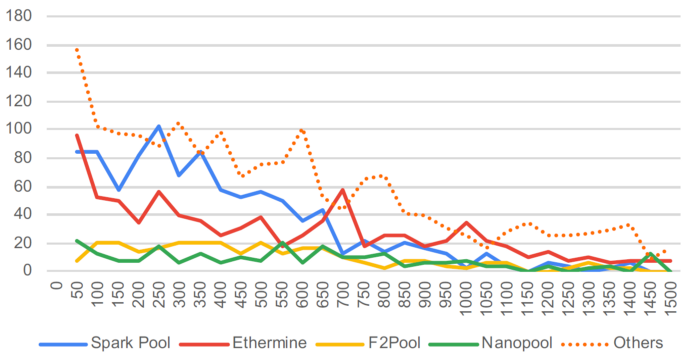 最后,我们测算了前四名以太坊矿池的分叉率。虽然他们控制了大多数算力,但我们发现他们并非主要的分叉产生者。相反,大部分分叉来自那些最晚加入新一轮报块竞赛的中小型矿池。我们也正与他们展开紧密合作改善网络连接。