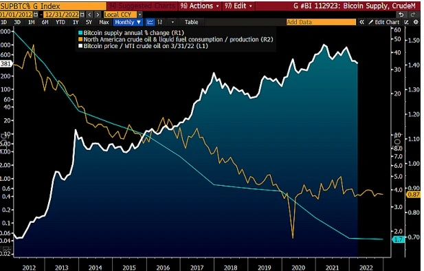 比特幣價值vs 原油負債和烏克蘭衝突。關於比特幣未來的一個非常重要的不確定點就是對它的“採用”。我們看到基準加密貨幣正在逐漸成為全球數字化抵押品。此外,人們對於原油和液體燃料的使用正在變少,而且成本也在變低、產量卻在增多,而且還極有可能被新技術和新能源所取代。圖表顯示了比特幣供應的下降趨勢以及北美原油、液體燃料產量供應過剩的趨勢,預計到2023 年,過剩量將達到13%。美國從此前的淨進口國轉變成為了出口量越來越大的出口國——而這則是商品價格的頭號殺手。