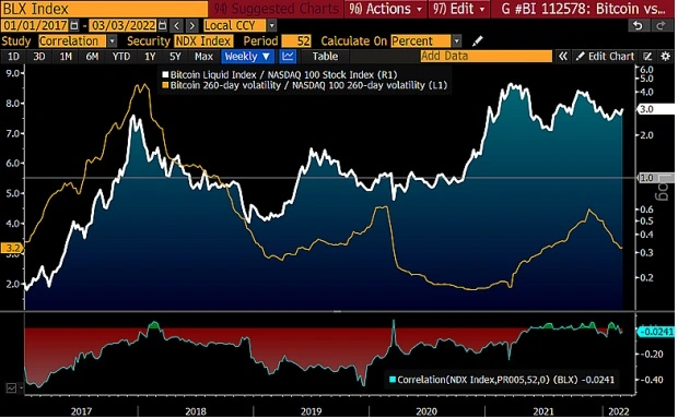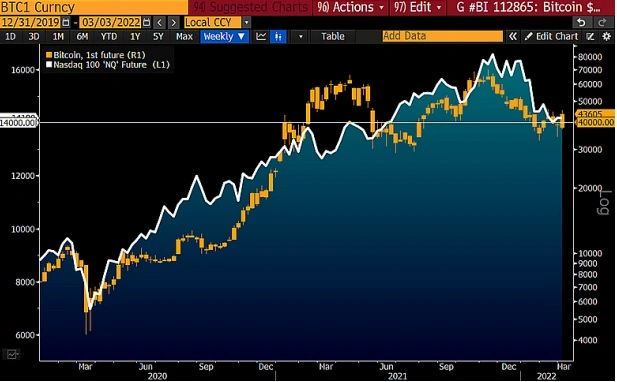 相比於納斯達克,比特幣已經表現出不同實力。 2022 年3 月2 日, 納斯達克100 指數下跌約13%,如果市場繼續下跌,那麼可能會影響到其他風險資產(尤其是加密貨幣),然而讓許多人沒有想到的是,比特幣僅下跌了5%。從歷史數據來看,股市表現通常不會好於加密貨幣,Bloomberg Intelligence 分析,比特幣可能會穩固在40,000 美元區間,而納斯達克100 指數也許會進一步下跌。