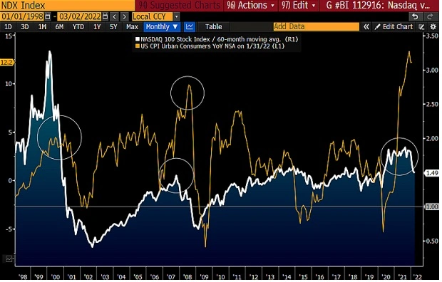所有資產都將受到通貨膨脹的影響。 2022 年,大多數資產價值都會縮水,因為美國通貨膨脹已經創下近40 年以來的最高記錄。不過,在這種情況下,可能會推動比特幣價格實現新的里程碑。根據Bloomberg Intelligence 的數據顯示,美國市場的生產者價格指數已經超過了2008 年的水平,納斯達克100 指數與60 個月移動平均線的表現相似,均值回歸風險升高。如果風險資產不下跌並減輕部分價格壓力,那麼美聯儲可能別無選擇,只能更積極地加息。