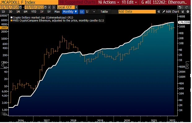 加密美元(穩定幣)和以太坊將迎來新一波大牛市?在烏克蘭衝突期間,美元正在證明其持久價值,不僅如此,在加密貨幣中美元其實也大獲全勝。以太坊區塊鏈上出現了許多穩定幣,這些基於美元的穩定幣進一步鞏固了以太坊價格,同時越來越多其他加密貨幣也都使用美元進行交易。 3 月2 日,Coinmarketcap 上前六名加密貨幣的市值達到1760 億美元,比2021 年初增長了約5 倍,Bloomberg Intelligence 認為幾乎無法阻止頭部加密貨幣市值達到數万億美元。