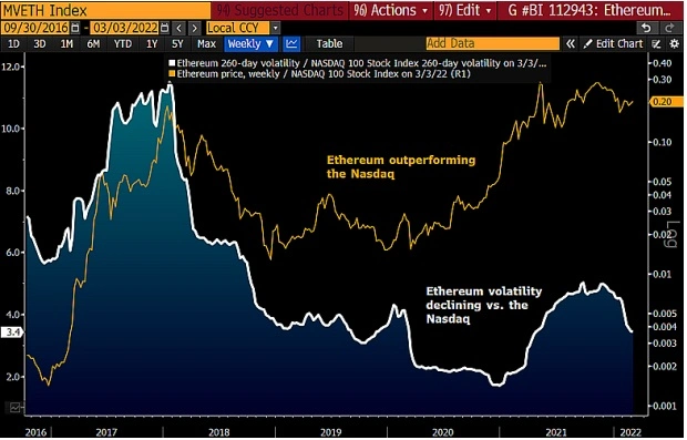 相比於納斯達克,以太坊波動性其實正在下降