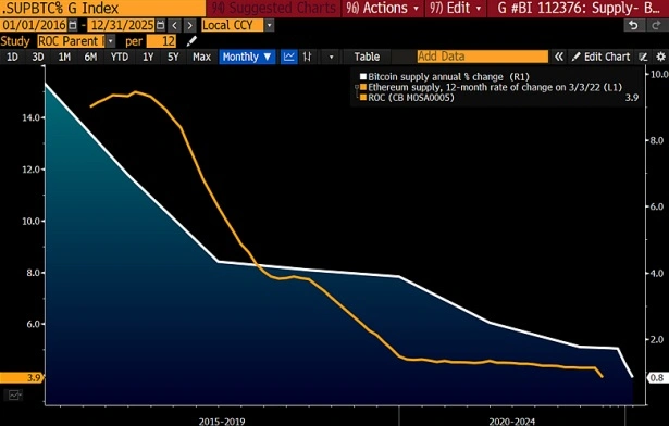 比特幣和以太坊供應量呈下降趨勢