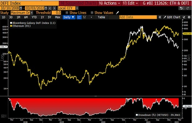 與納斯達克相比,以太坊表現依然佔據上風。在當前烏克蘭衝突背景下,相對於納斯達克100 指數,以太坊的優勢表現可能會得到進一步擴大。在烏克蘭衝突之前,作為去中心化金融(DeFi) 和NFT 的基石,以太坊上漲的原因主要有兩個:一個是市場表現較為穩定,另一個是相對於股票指數的風險不斷下降。以太坊的260 天波動率在2018 年時創下峰值,當時是納斯達克100 指數波動性的11 倍左右,但之後,以太坊的這一風險衡量指標一直在下降,目前以太坊260 天波動率只有不到納斯達克100 指數波動率的3 倍。當然,納斯達克100 指數波動性的增長主要是因為地緣衝突增加了經濟衰退風險和股市波動。