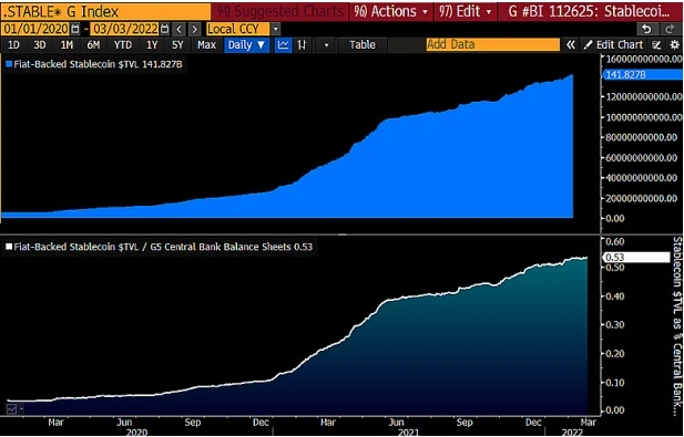 由法定貨幣支持的穩定幣規模在央行資產負債表規模中的佔比