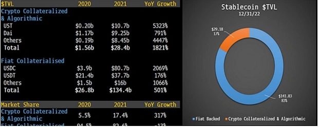 加密美元(穩定幣)正在扮演“DeFi 黃金”的角色。隨著時間的推移,過去許多不相信DeFi 的人發現,越來越多法定貨幣被“無情地”兌換成穩定幣。數據顯示,目前流通中由法定貨幣支持的穩定幣總額已經達到1410 億美元,比2021 年增長了四倍。這種增長的主要驅動力是人們希望在DeFi 中尋求更高的收益回報,並在熊市中尋求風險對沖。