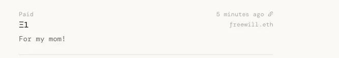「給我媽買的!」一個域名為freewill.eth 的人說著,然後將價值4300 美元的1 ETH 轉給了一個正在募資的DAO,此時,他的以太坊錢包裡只剩下不到0.2 ETH。