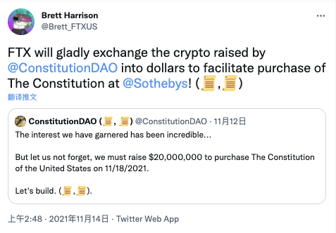短短幾天時間,ConstitutionDAO 已經通過Juicebox 募資平台成功眾籌到了超1 萬枚ETH,約合4300 萬美元,加密貨幣交易平台Gemini、Coinbase、頂級資本a16z 等知名機構紛紛為其進行宣傳,此外,由於在蘇富比的拍賣需要使用法幣參與,FTX US 總裁Brett Harrison 表示FTX 也願意為ConstitutionDAO 提供加密貨幣與法幣的兌換服務。