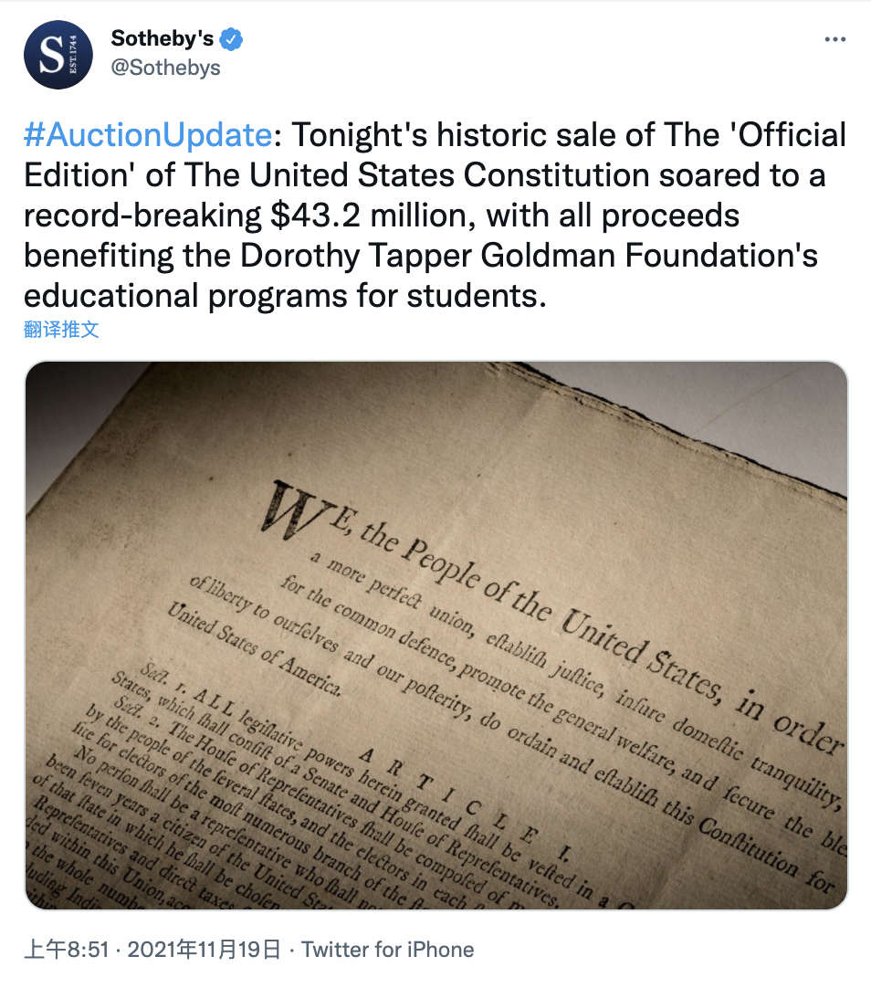 11 月中旬,世界頂級拍賣行蘇富比將拍賣一份官方初版印刷的美國憲法,也是現存唯一一份掌握在私人收藏家手中的副本,蘇富比對其估值在1500 萬至2000 萬美元之間。這件副本上一次在市面上流通還要追溯到1988 年,被一位已故的紐約房地產開發商以16.5 萬美元的價格收入囊中。而這一次在蘇富比拍賣取得的收入也將捐給以其妻子名義成立的慈善基金會,以進一步提高公眾對民主的認識。