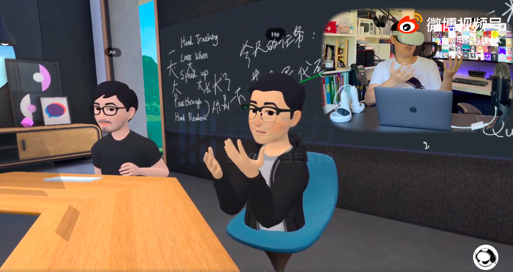 你在現實中的動作、講話的手勢、眉毛的跳動,都可以完全映射到虛擬空間,而在虛擬空間內的肢體接觸,在現實中也能感知。你的鍵盤、顯示器,都可以無縫映射在虛擬世界,在現實的鍵盤上打字,一樣可以在虛擬的屏幕上看到;微信、郵箱的彈窗提醒,同樣可以出現在你眼前的虛擬空間。