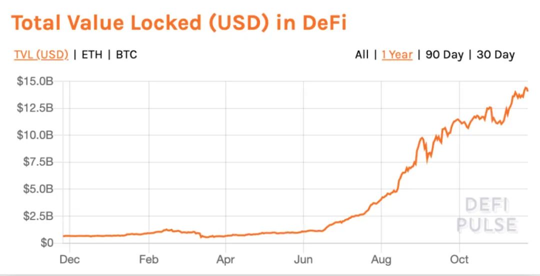 DeFi(去中心化金融)的受歡迎程度在過去一年中呈爆炸式增長,如今已將近150億美元鎖定在DeFi智能合約中,而去年12月才不足10億美元。