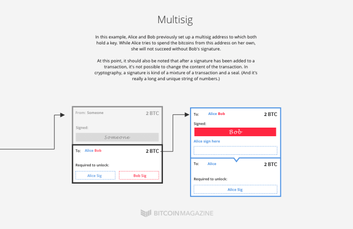 顧名思義,多簽名地址就是需要多個私鑰來“解鎖”、使用比特幣的地址。多簽名地址的條件可以設置得很多樣。比如,可以要求在3 把私鑰中要有2 把參與,才能轉出比特幣;或者是其它的數量要求(比如2/5,3/4,等等)。