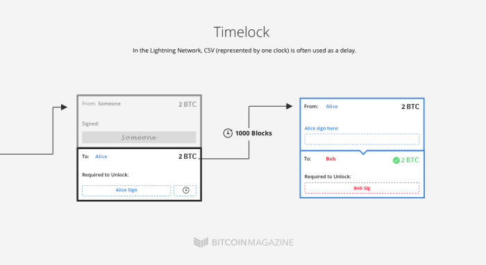 有兩種類型的時間鎖:1)絕對時間鎖,叫做CheckLockTimeVerify(CLTV);2)相對時間鎖,CheckSequenceVerify(CSV)。 CLTV 會鎖定比特幣直至未來某個(可以說是)具體的具體:一個具體時間和日期,或者一個具體的區塊高度;而CSV 只會使用相對時間。當一個CVS 輸出上鍊之後,就要等待一定數量的區塊後,這筆輸出才能花用。
