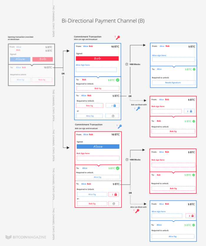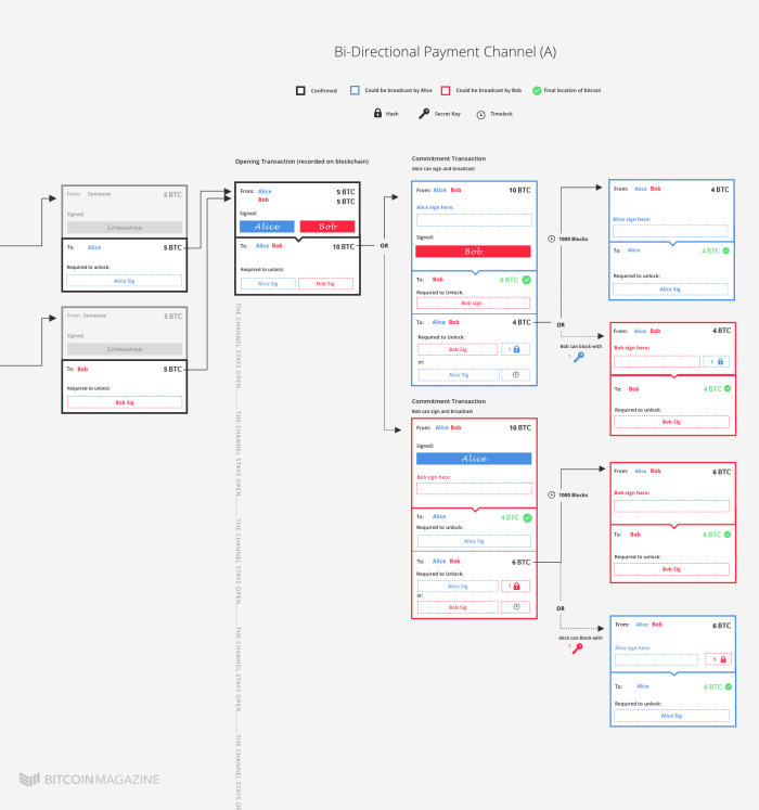要建立一個雙向的支付通道,參與的雙方都必須首先對一筆開啟通道事務達成共識。這筆開啟事務決定了他們倆各要在這個通道中存入多少比特幣。