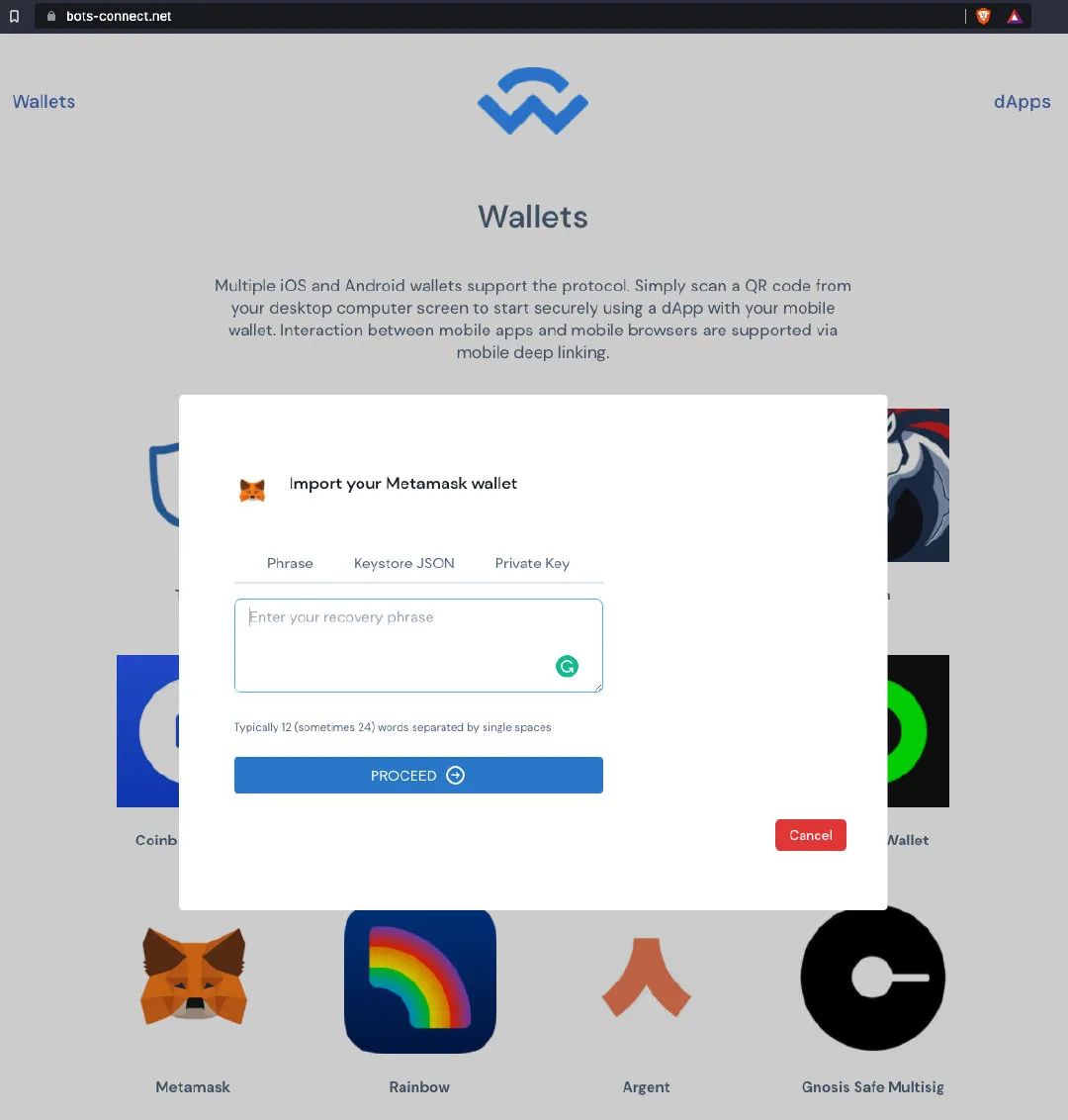 詐騙者稱平台和你的錢包之間存在連接問題。要解決這個問題您需要再次同步並導入你的錢包。然後,你會收到一個鏈接,將你帶到一個類似下面的網站。