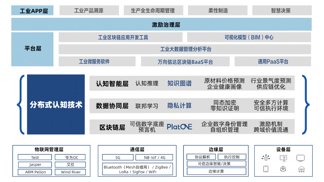 分佈式認知工業互聯網在工業互聯網技術的基礎上,集成了區塊鏈、知識圖譜、隱私技術等分佈式認知智能技術,以幫助傳統工業製造業應對數字化轉型過程中面臨的挑戰。分佈式認知工業互聯網平台在已存在的工業互聯網平台的基礎上,覆蓋整個區域產業生態,同時保障與解決了數據隱私、數據主權與數據有效利用等問題。