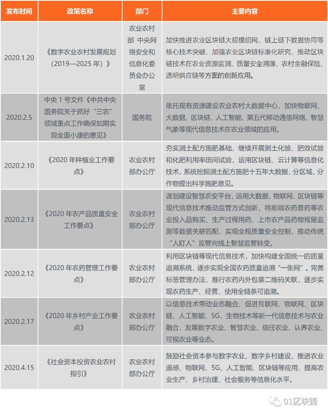 目前,農業已經成為國家重點鼓勵的區塊鏈應用領域,據01區塊鏈不完全統計,2020年上半年,國家已經發布7部“區塊鏈+農業”相關政策。