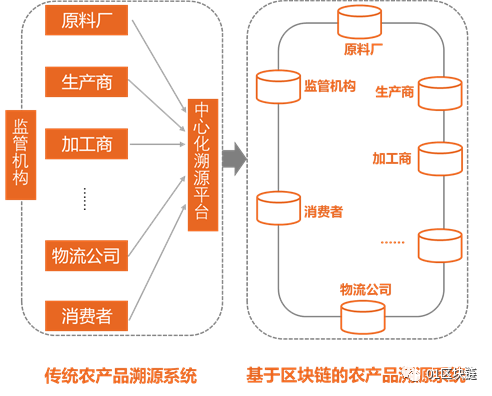 圖1 傳統農產品溯源系統和基於區塊鏈的農產品溯源系統對比