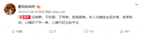 肥宅也很有意思,他和很多幣圈知名的交易員不一樣。他的微博置頂就是:沒有群,不私聊,不帶單,拒絕跟單。本人為隨性主觀交易,勝率極低,心情好了開一單,心情不好立刻平倉。