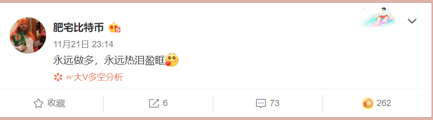他是一個堅定看多比特幣的賭徒。 “永遠做多,永遠熱淚盈眶 。”“現在是死多的時代。”這是他的微博名言。