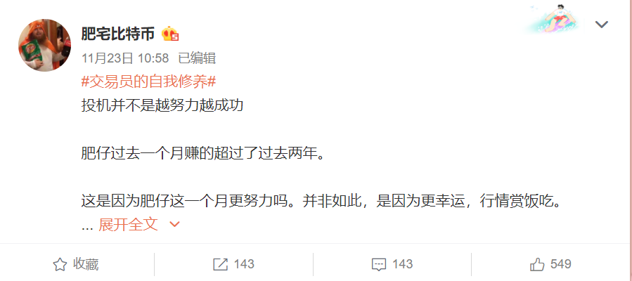 看肥宅的微博,可以看他的一些交易的心得,以下內容來自他的微博話題“交易員的自我修養”,這或許是他成功的一些法門。