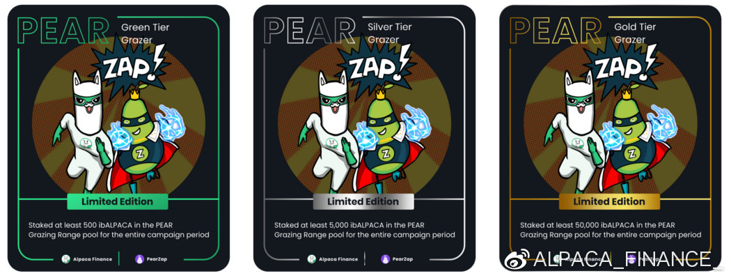 要符合領取資格,您必須在GMT時間2021年10月6日上午10點前(即牧場池上線後1天內) ,在PEAR牧場池質押ibALPACA ,直到11月2日上午10點(至少27天) 。您收到的NFT 卡片等級將以質押的ibALPACA 數量來決定。